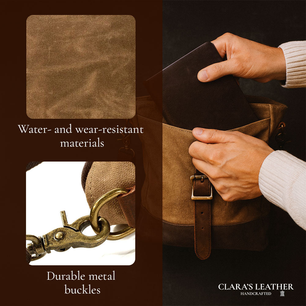 - Durable et Longue Durée : Fabriqué en toile cirée et cuir de vachette, résistant à l'usure et à l'eau.